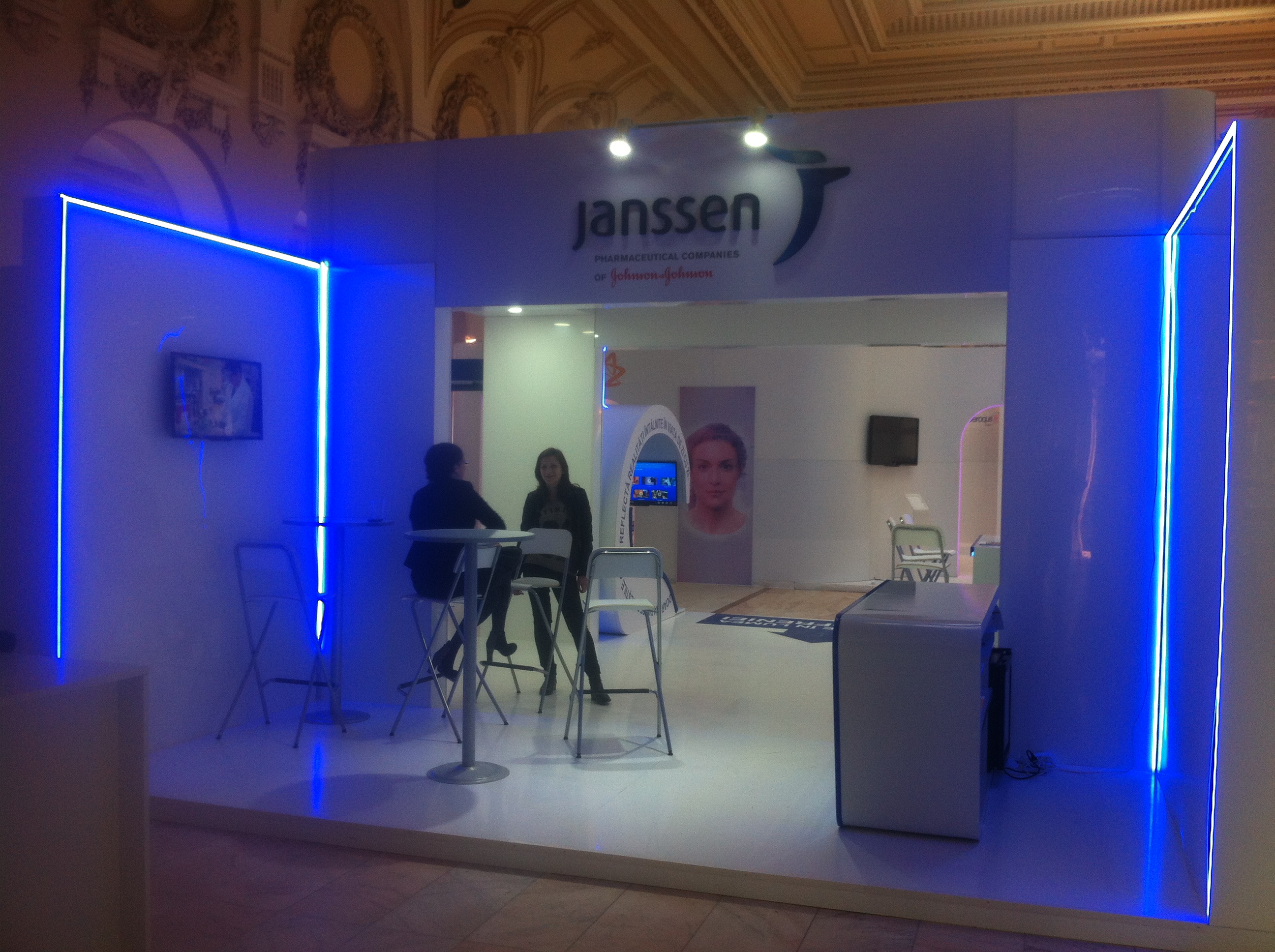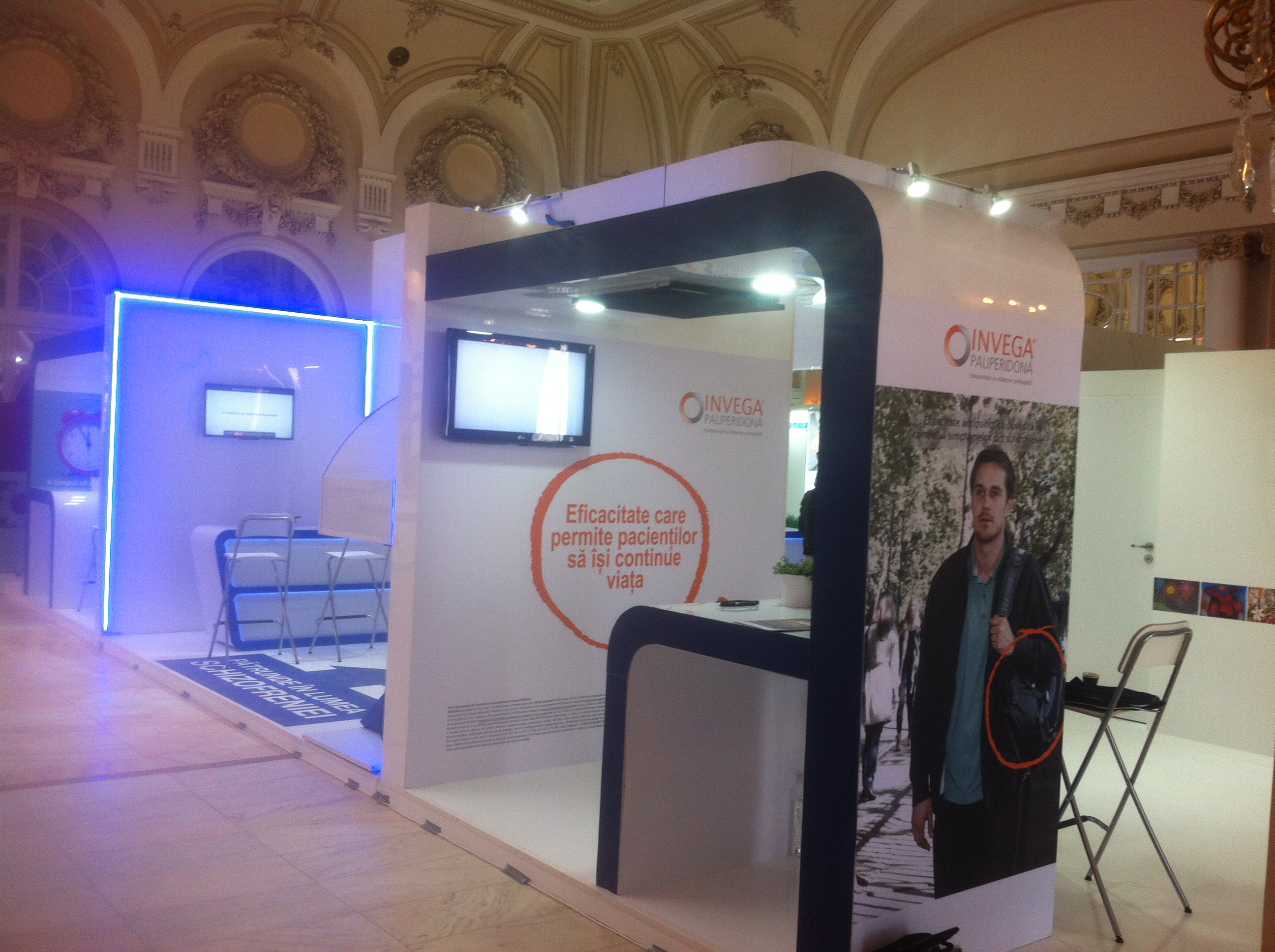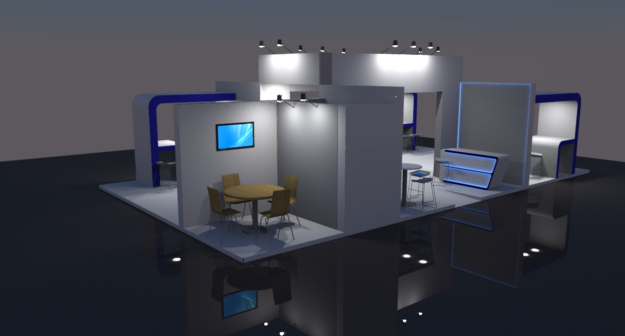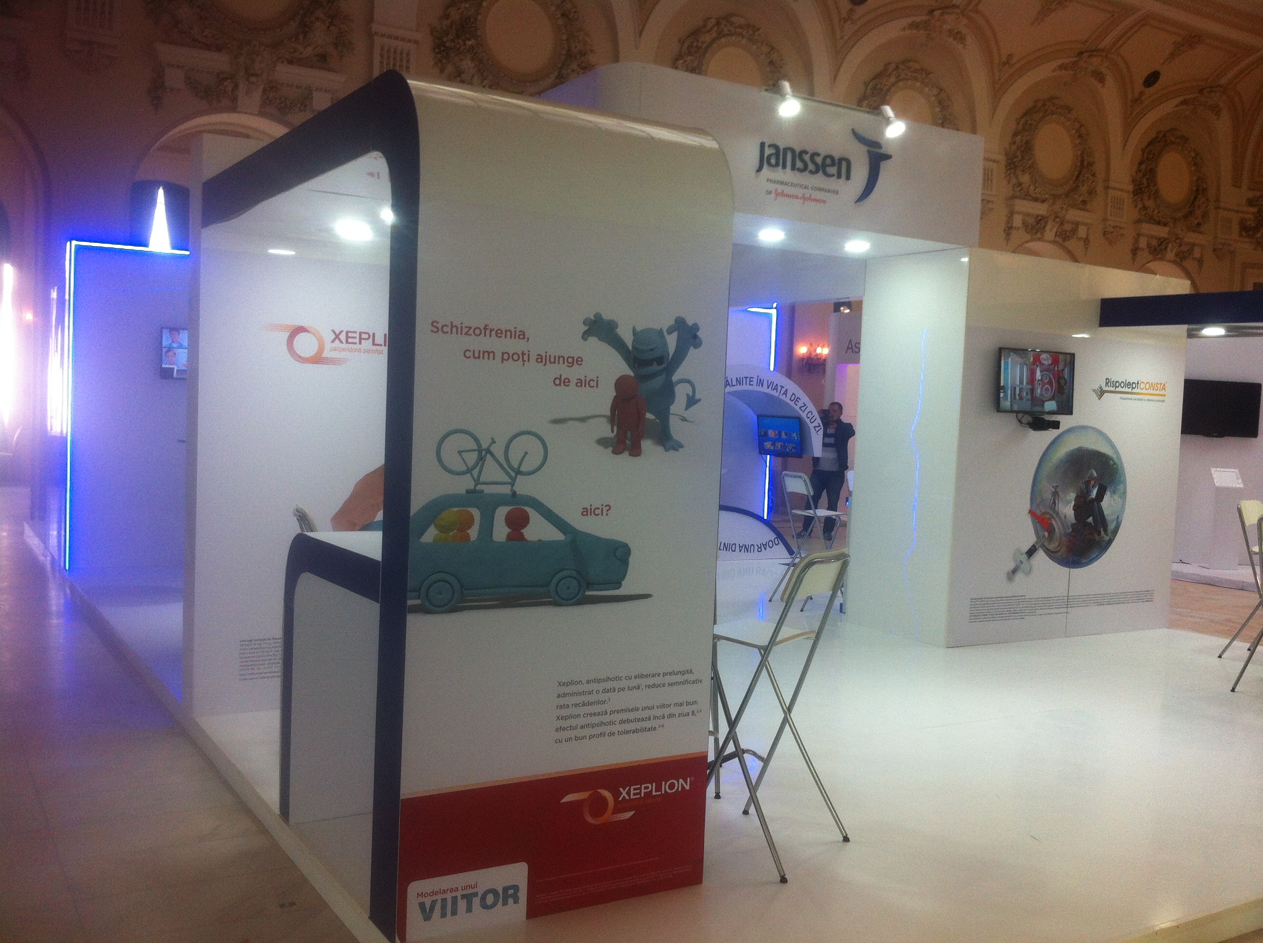 Stand de companie modular, un design in care accentul s-a pus pe partea de networking, cele 2 baruri din zona centrala precum si cockpit-ul atragand vizitatorii in stand. Clientul si-a exprimat dorinta de a folosi cele 3 zone de produs independent pentru evenimentele viitoare, modularitatea standului ne permite astfel sa realizam diverse configuratii, in functie de locatie sau suprafata disponibila.