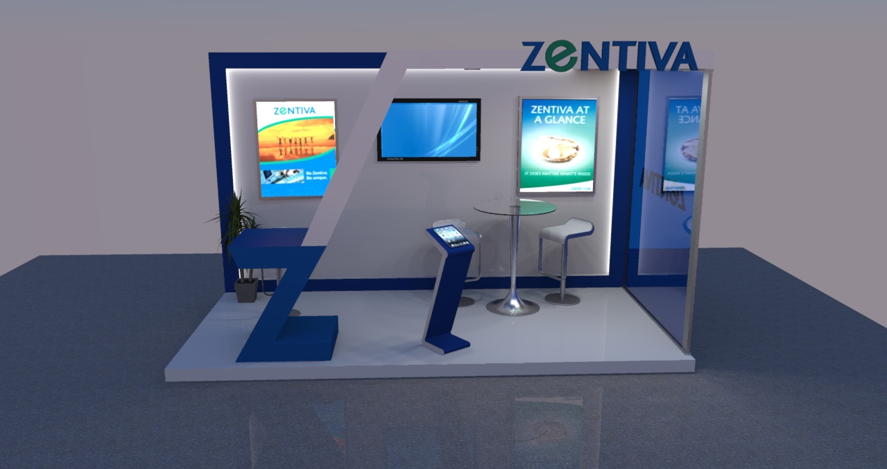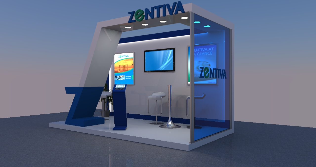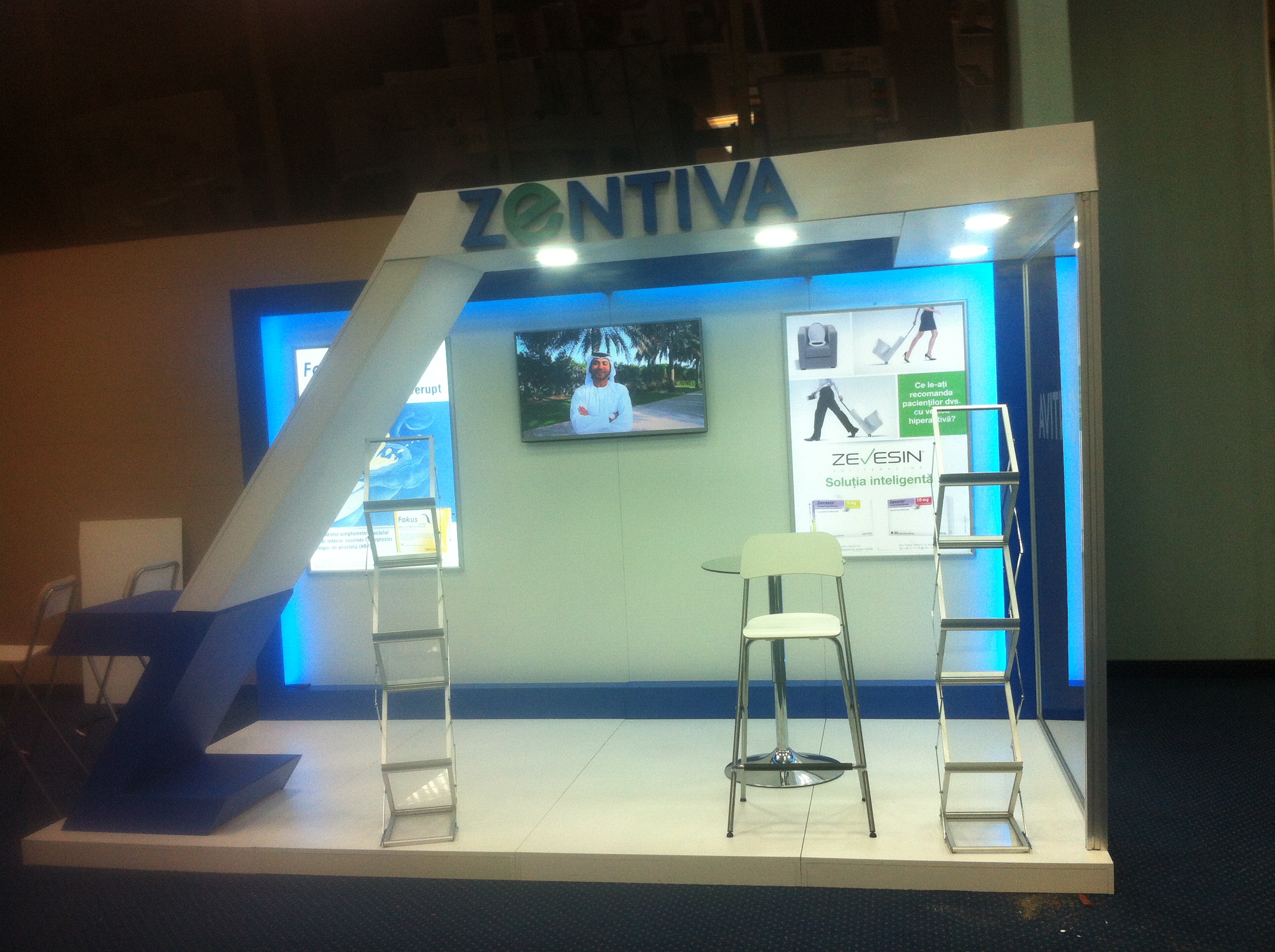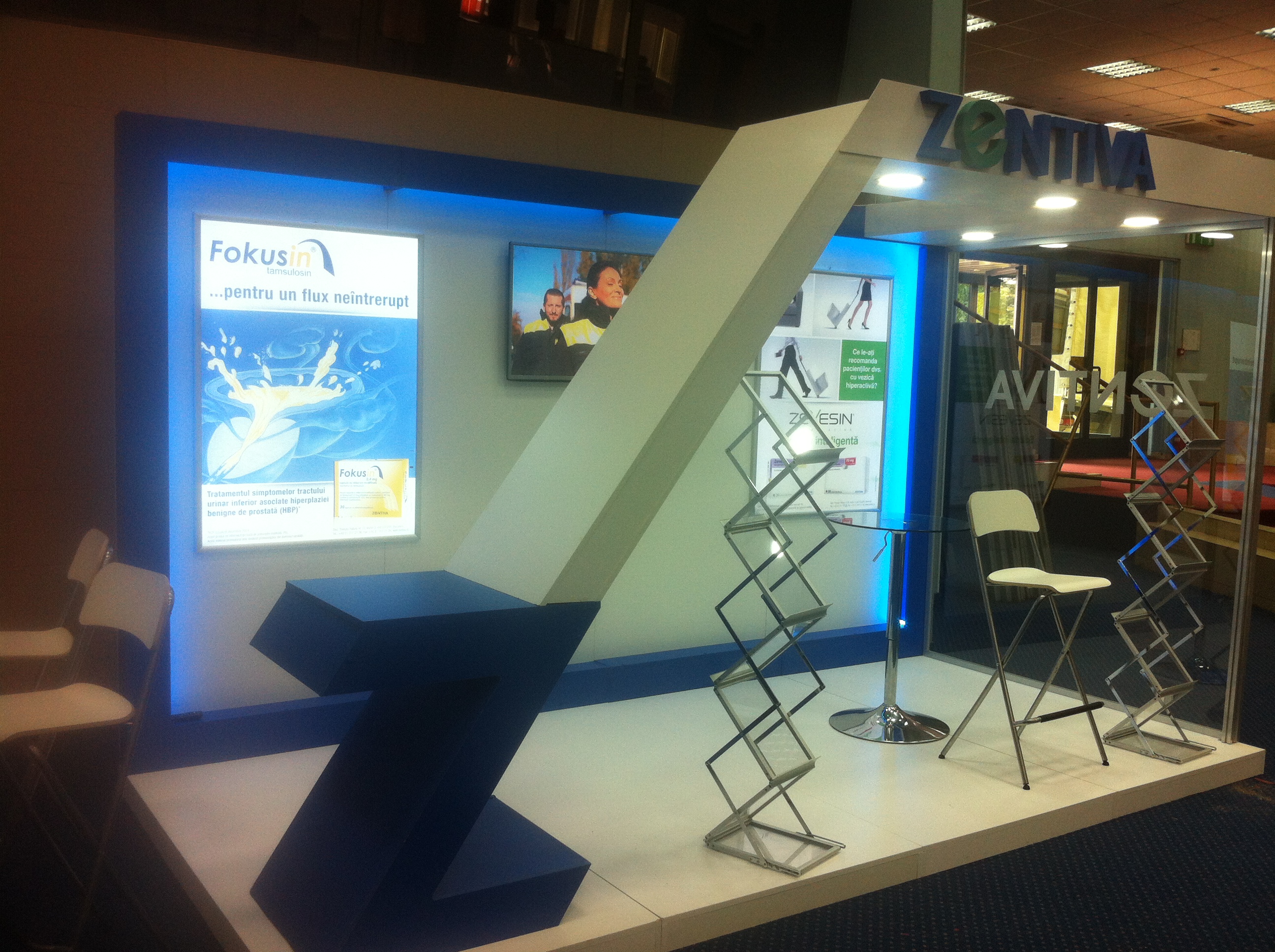 Stand personalizat in culorile de brand Zentiva, info-desk stilizat in forma literei “Z”, casete cu retroiluminare, Z holdere pentru brosuri sau flyere. .